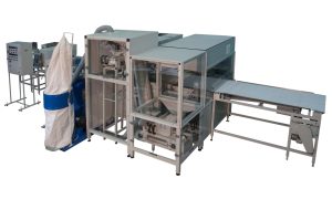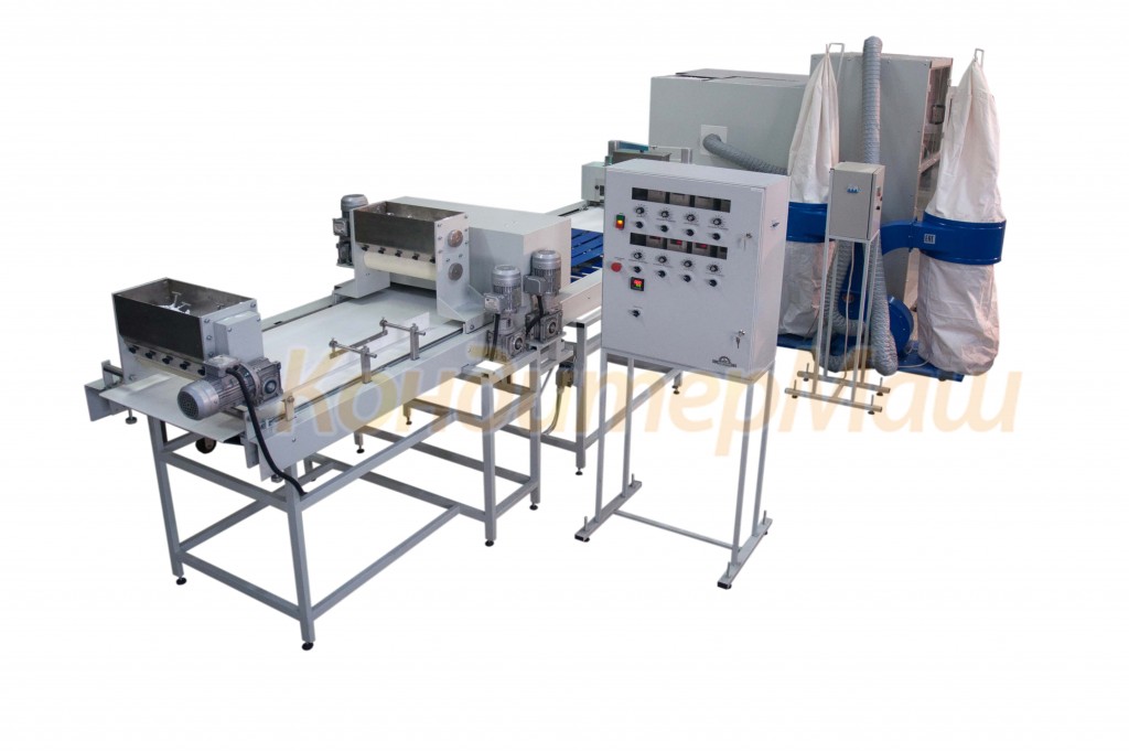 Принцип работы: Готовый полуфабрикат продукта(пласт) в ручную подаётся на конвейерную ленту продольного делителя. Дисковый делитель обеспечивает деление пласта на продольные заготовки. Затем предварительно разрезанные заготовки попадают на ленточный конвейер, где происходит отделение разрезанных жгутов друг от друга. Затем разделённые жгуты переходят на конвейер гильотинной резки. Гильотинная резка обеспечивает поперечное деление на заготовки требуемой длины. Затем готовые заготовки попадают на конвейер окончательной автоматической посыпки сахарной пудрой с функцией автоматического возврата излишек пудры в приёмный накопитель станции посыпки.