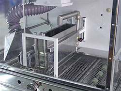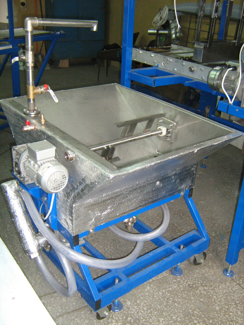 для подачи глазури используется обогреваемый шести лопастной насос безотказно зарекомендовавший себя в производстве. Для удобства смены глазури с одного цвета на другой, удобства гигиенической обработки и лёгкого доступа для технической профилактики, машина глазирования оснащена выкатной ванной с водяной рубашкой и быстросъёмным конвейером глазирования, для перемешивания глазури в выкатной ванне установлена мешалка. Для удаления «хвостиков» с глазированного изделия машина оснащена обогреваемым каплесъёмным валиком с функцией реверса(вращение в разные стороны). Во избежание попадания посторонних фракций в насос машина глазирования оснащена системой фильтрации. Для исключения намерзания глазури на выходе с конвейера глазирования, машина оснащена обогреваемым переходом. Для регулировки толщины слоя глазури(функция обдува) используется мощный промышленный центробежный вентилятор.