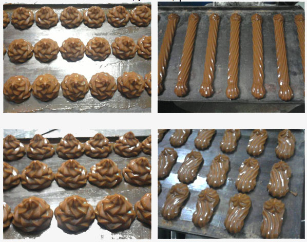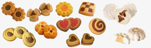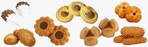 Двух бункерная отсадочная машина с устройством струнной резки позволяет получать такие изделия, как: сдобное, песочное печенье с различными начинками, наиболее часто применяемыми из которых следует назвать варёное сгущенное молоко и фруктовые конфитюры.Машина успешно формует двухцветные тестовые заготовки самого разнообразного вида и формы.