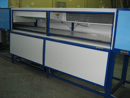 Конвейер приводится в движение электродвигателем и редуктором, для плавного изменения скорости используется частотно-регулируемый привод. На конвейер с левой стороны машины укладывается продукция для охлаждения и поступает в зону работы воздухоохладителя. Охлажденные изделия подаются конвейером на стол сбора готовой продукции. Объем подачи охлажденного воздуха регулируется с помощью дистанционного управления с использованием микропроцессора (вывод температуры в камере, рабочего состояния агрегата, причин сбоев; задание требуемой температуры в камере, параметров оттайки и других параметров работы компрессорно — конденсаторного блока. Нужная температура внутри камеры охлаждения достигается с помощью рециркуляции охлажденного воздуха.